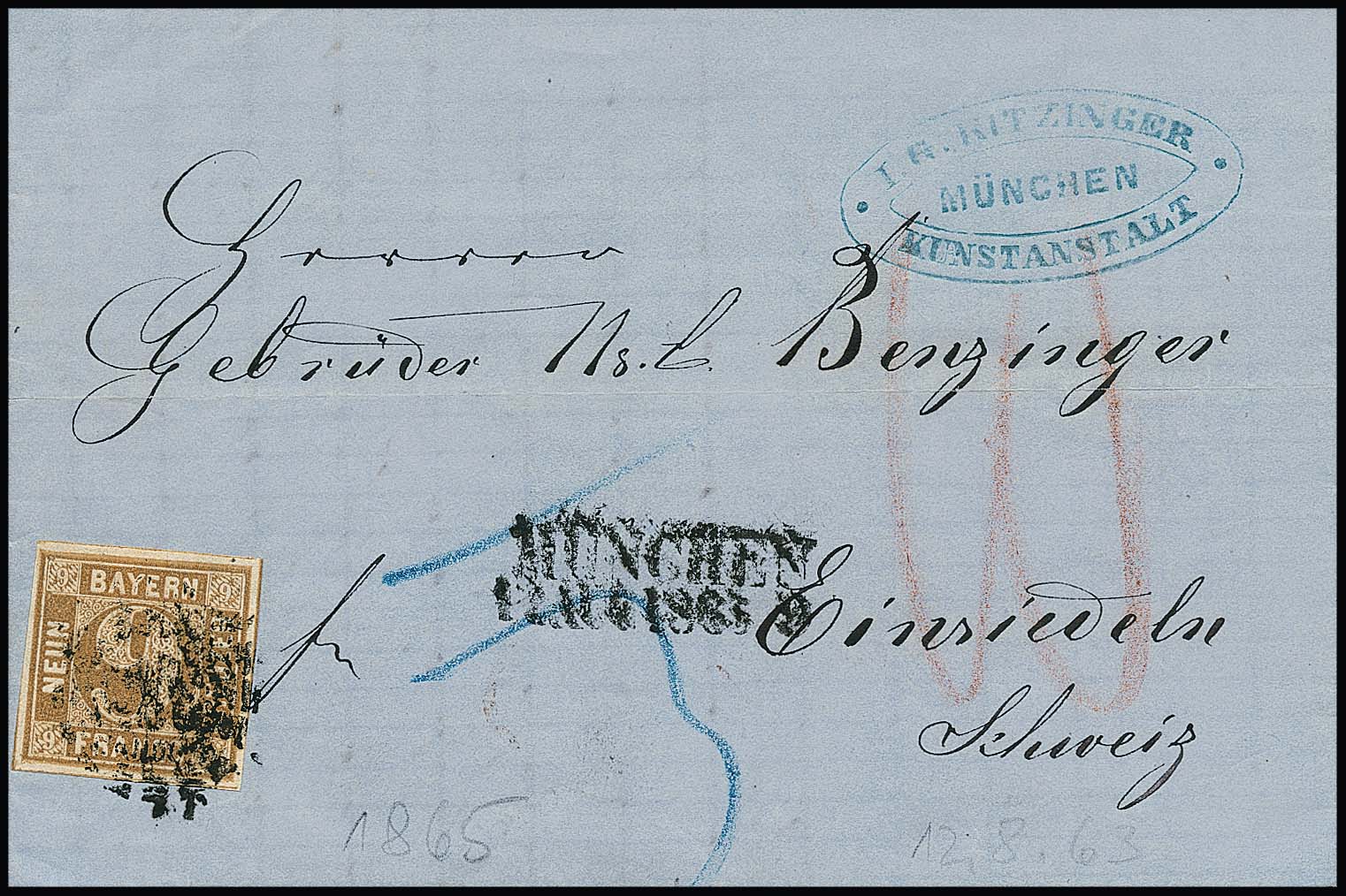9 Kr. gelbbraun, breitrandig, auf tadellosem Brief von München nach Einsiedeln/Schweiz 1863. Nur bis zur Grenze frankiert, restliches Porto von "3" Kr. vorderseitig austaxiert und umgerechnet "10" Rp. vom Empfänger erhoben