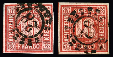 18 Kr. rot, zwei Kabinettstücke mit oMR, "28" bzw. "32", je sign. Sem. Mi. 440,-
