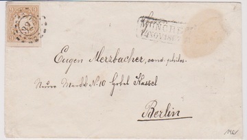 9 Kr. ockerbraun, teils überrandiges Kabinettstück einzeln auf Couvert (rechts kl. Fleck) von München 1867 nach Berlin, sign. Brettl. Mi. 220,-