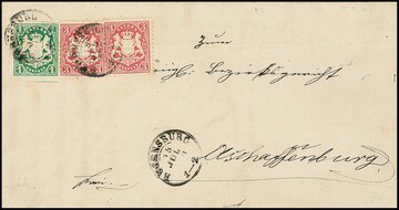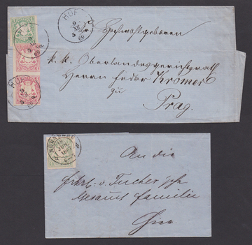 1 Kr. grün, breitrandig, auf Pracht-Ortsbrief aus Nürnberg, sowie 1 Kr. bläulichgrün nebst Paar 3 Kr. rosa (eine Marke Bugspur) auf Faltbrief von Hof nach Prag