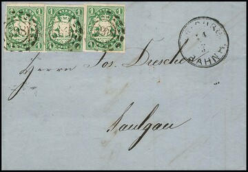 1 Kr. dunkelblaugrün per drei, mittlere Marke unten "Lupenrand", sonst breitrandig, auf Prachtbrief mit oMR "598" und K2 "Augsburg Bahnh.", sign. Brettl
