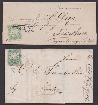 1 Kr. dunkelblaugrün einzeln auf Pracht-Ortsbrief aus Nürnberg, Mi. 220,-, ferner 1 Kr. gelbgrün auf Kabinett-Ortsbrief aus München, beide sign. Brettl