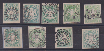 1 Kr., die Abstufungen der Grün-Töne, neun Werte in fast nur verschiedenen Nuancen, von hellgelblich- bis dunkelblaugrün (zweimal "c"), Mi. 295,-