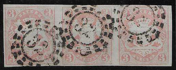 3 Kr. rosa, Pracht-Dreierstreifen mit oMR "32", sign. Pfenninger, dazu 3 Kr. rot mit Postablage-L2 von Neuendettelsau