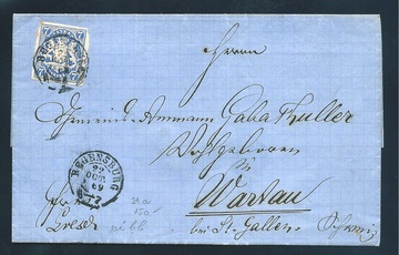 7 Kr. blau, meist breitrandig, auf Prachtbrief von Regensburg 1869 nach Wartau bei St. Gallen/Schweiz