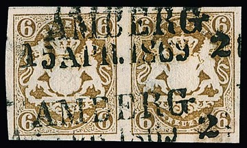 6 Kr. ockerbraun, breitrandiges Prachtpaar mit zweifachem L2 "Amberg 2", rechte Marke unbed. Seidenfaden-Lockerung. Mi. 380,-