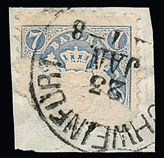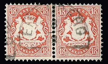18 Kr. dunkelziegelrot und 1 Mk. purpur, je gest. Kabinettstücke, sign. bzw. Fotoexp. Sem. Mi. 360,-