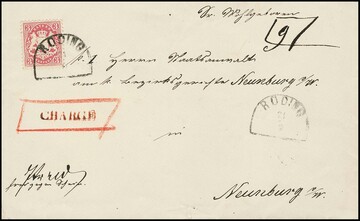 3 Kr. rosa auf Luxus-Chargé-Brief mit HK "Roding", ungewöhnlich roter L1 "CHARGÉ" zusätzlich handschriftlich rot umrahmt, hs. "7 Kr. recd."