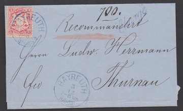 3 Kr. rosa auf blauem Kabinett-Recobrief mit blauem K1 "Bayreuth Bahnh.", Chargégebühr bar bezahlt, sign. Brettl