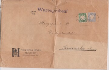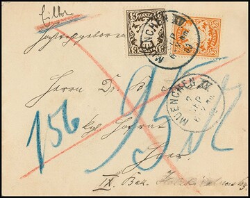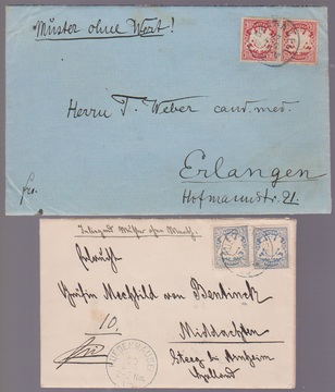 10 bzw. 20 Pfg. je per zwei auf übergewichtigen Briefen "Muster ohne Werth" (über 250gr.) Inland, bzw. Ausland