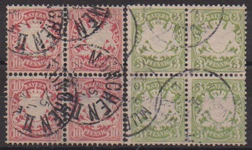 10 Pfg. karmin und 3 Pfg. grün je im gest. Viererblock, Mi. 325,-