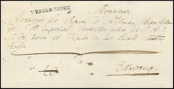 "Regensburg", 1787/88, erster L1 "v. REGENSBURG" in rot und schwarz (2) auf drei Briefen, zwei versch. Typen (!) mit großem und kleinem "v." (R!)