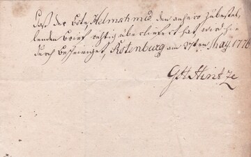 "Rotenburg", 1776, frühe hs. Briefrecepisse "Daß der Bote Helmscheid den anhero zu bestellenden Brief richtig überliefert hat, wird hierdurch bescheinigt"