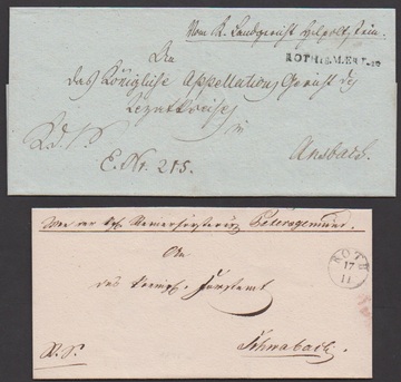 "Roth", 1820, seltener L1 mit Datum, sowie Fingerhut-K1 (1845), auf zwei Briefen