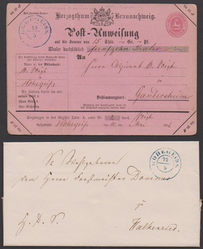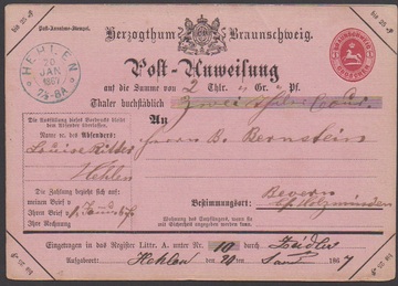 "Hehlen", besserer blauer K2 auf Teilbrief 1866, sowie auf Postanweisung 1 Gr. 1867