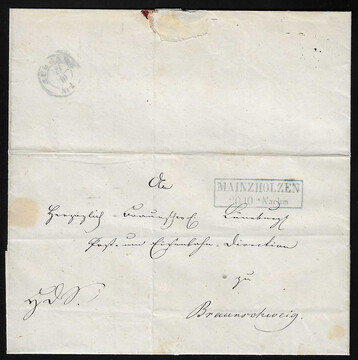 "Mainzholzen", blauer Ra2 auf Brief 1857 und Postschein 1863