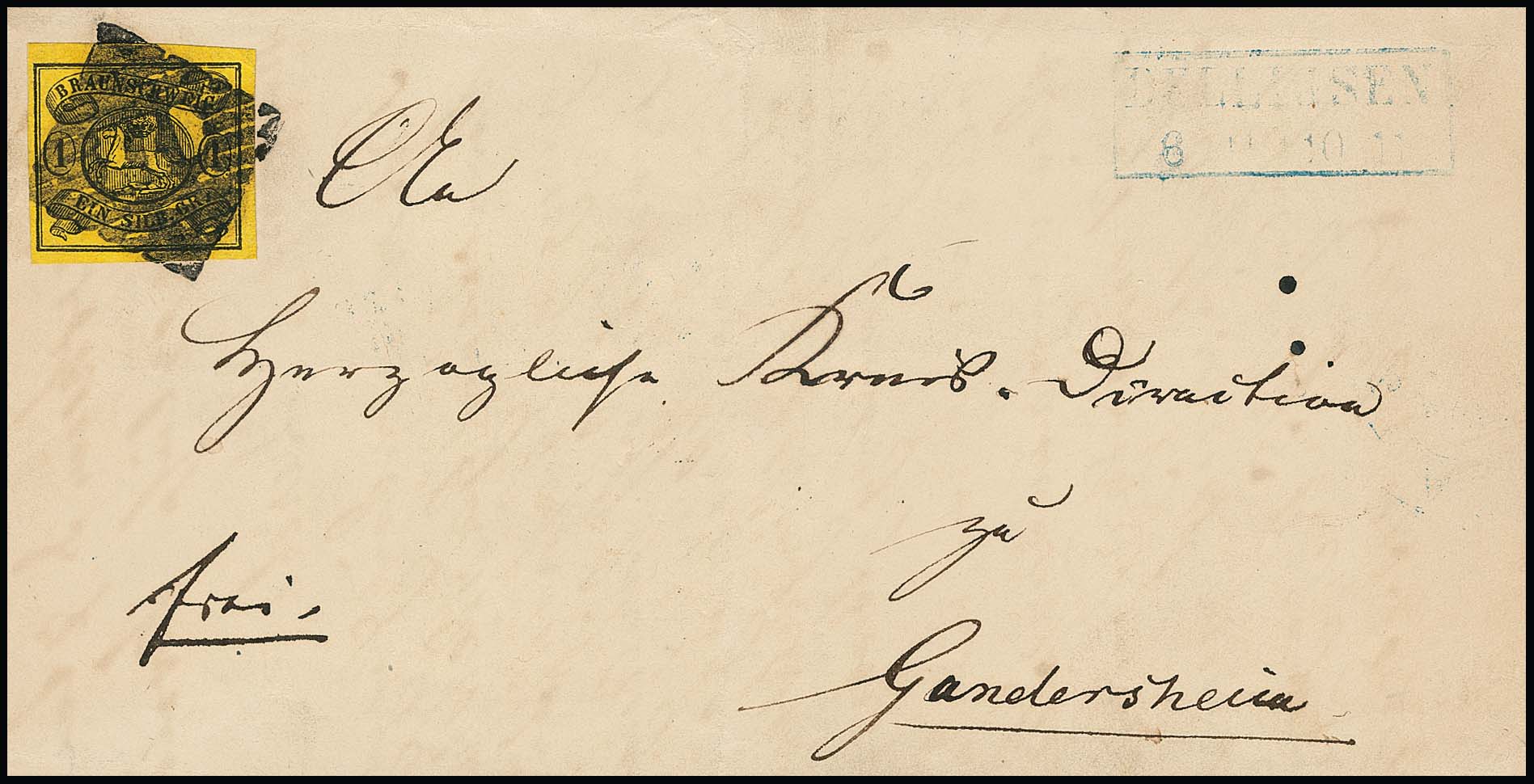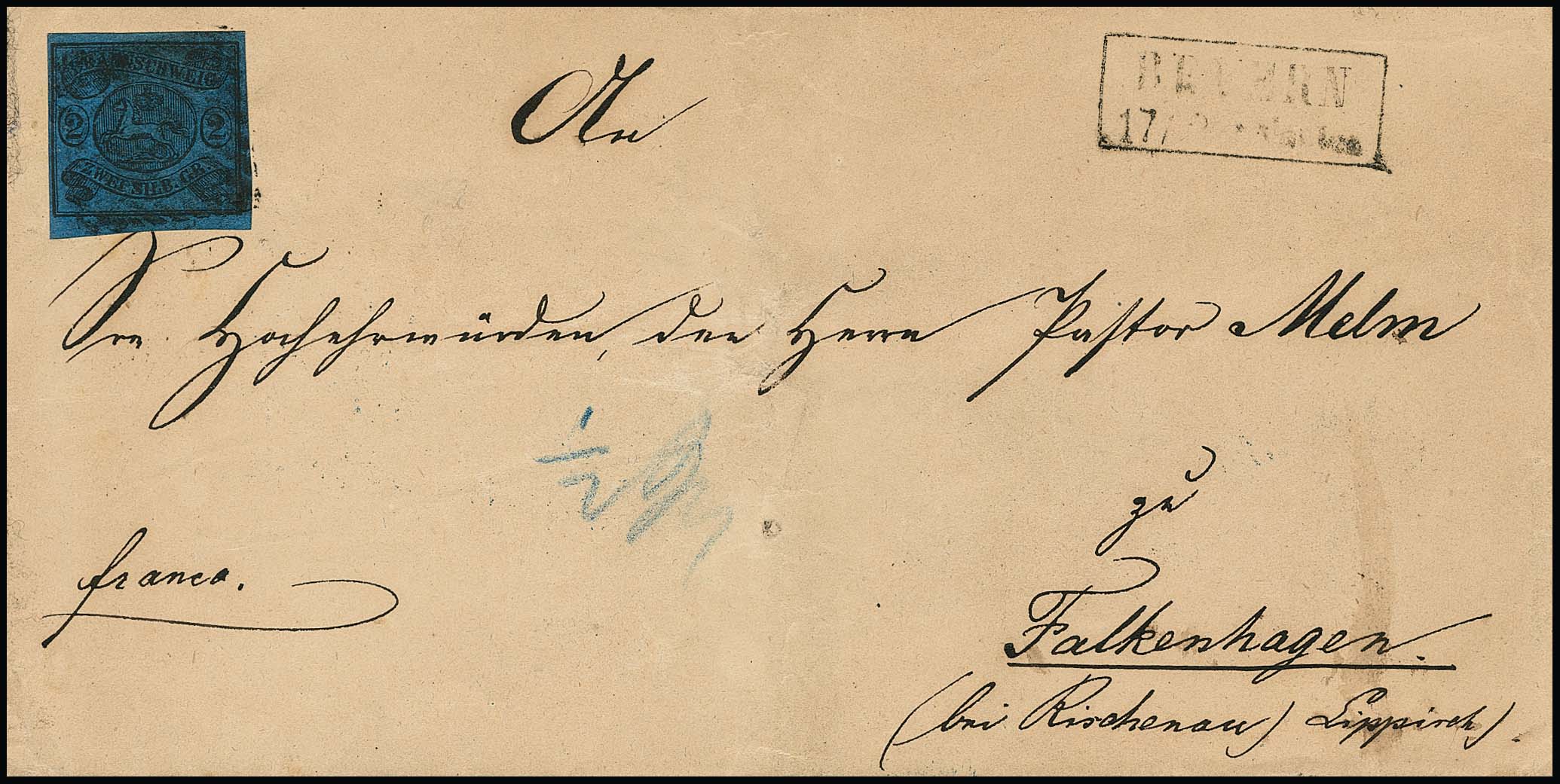 2 Gr. blau (min. "eckrund") auf Prachtbrief mit K2 "Braunschweig", sign. Krause. Mi. 450,-