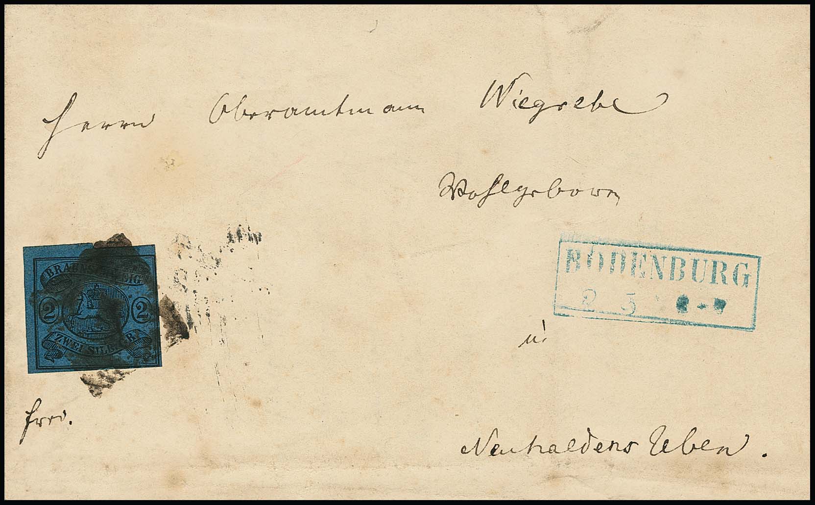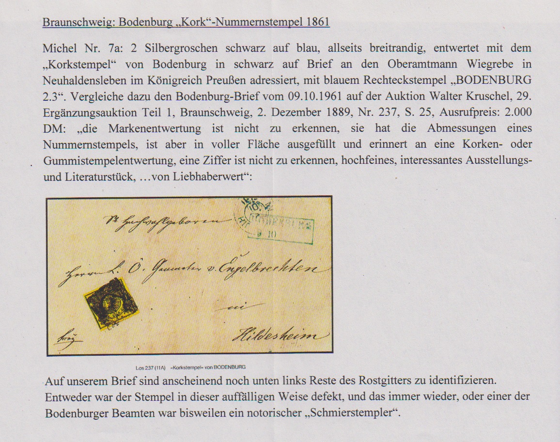 "5" typisch wie ein "Korkstempel", nebst blauem Ra2 "Bodenburg" auf Brief 2 Sgr. (leichte Gebrauchsspuren, Marke etwas "Lupenrand")