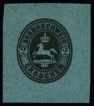 2 Gr. schwarz auf blauem Kartonpapier, Probedruck von 1865, "kleines Pferd mit Krone und darunter Arabesken"