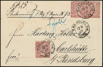 "P. Hamburg FHP.", der aptierte Fahrpost-K2 noch 1869 nachverwendet auf Paketbegleitbrief mit dreimal NDP 1 Gr. (eine kleiner Randbug, Paketzettel abgefallen)