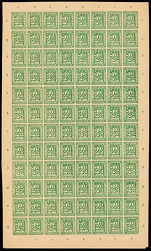 2 1/2 Sch. grün, gezähnt, Nachdruck der Druckerei C. Adler im vollständigen Bogen von 96 Exemplaren mit allen Rändern und Bogenzählnummern, in für einen solchen Bogen überdurchschnittlicher Erhaltung (leicht angetrennt und zwei Marken in der Zähnung gestützt). Attest Mehlmann