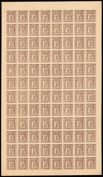 1 1/4 Sch. lila, geschnitten, Nachdruck der Druckerei C. Adler im vollständigen Bogen von 96 Exemplaren mit allen Rändern und Bogenzählnummern, in für einen solchen Bogen überdurchschnittlicher Erhaltung (unbedeutende Pünktchen). Attest Mehlmann