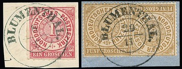 "Blumenthal", idealer nachverw. schwarzer K2 auf zwei NDP-Luxusbriefstücken 1 Gr. rosa bzw. zweimal 5 Gr. braun (diese als Kehrdruck geklebt)