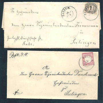 "Bassum", nachverw. schwarzer K2 auf zwei Briefen, NDP Dienst 1 Gr. bzw. 1 Gr. Brustschild