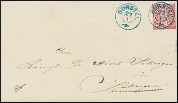 "Borstel", nachverw. blauer Zier-K2 auf Kabinettbrief 1 Gr. NDP, sowie in schwarz auf Brief 1 Gr. Brustschild, dazu zwei Ablöser-Briefe