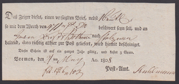 "Bremen", 1808, "Post-Amt", seltener Ortsdruck-Postschein ohne Hoheitsbezeichnung, W12/200 P.