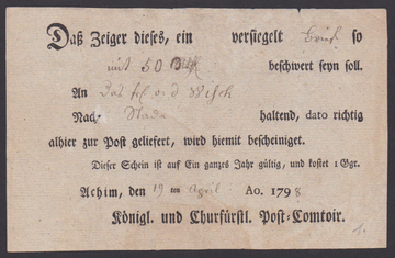 "Achim", 1798, "Königl. und Churfürstl. Post-Comtoir", Ortsdruck-Postschein