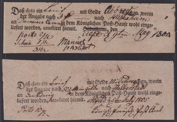 "Alfeld", 1804/5, zwei preußische Postscheine (einmal hs. über Ortsdruck "Hildesheim"), Hb. 7a/b