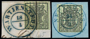 1 Ggr. schw./grün, sechs ausgesuchte Kabinett-/Luxusbriefstücke, je klare zentr. Stempel