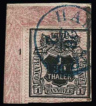 1/10 Th. schw./orange, linke untere Bogenecke mit Teil der Reihenzahl "1", sowie großes Bordüren-Unterrandstück mit Reihenzahl "9", kl. Mgl.