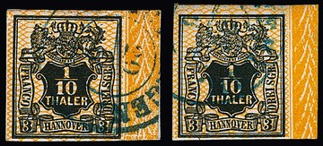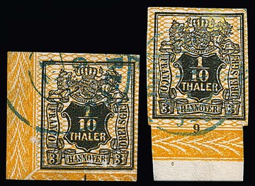 1 Gr. schw./grün einzeln breitrandig auf Kabinettbrief mit Ra2 "Melle", sowie im Paar auf Kabinettbrief mit K2 "Beverstedt", dabei linke Marke kurios unentwertet