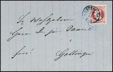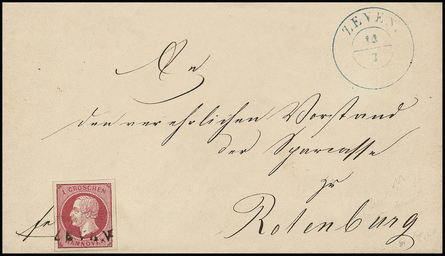 1 Gr. rosa auf Kabinettbrief mit schwarzem L1 "Zeven" (wahrscheinlich Vorausentwertung), blauer K2 nebengesetzt
