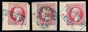1 Gr. rosa, lilarosa, drei klar zentrisch gestempelte Kabinettbriefstücke, einmal vom Rand, u.a. K1 "Essel"