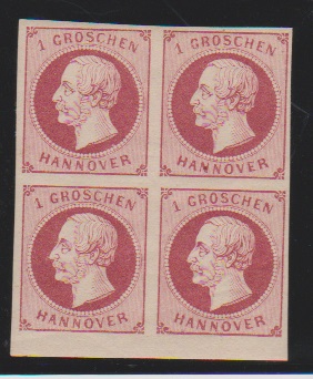 1 Gr. lilarosa, ungebrauchter Luxus-Unterrand-Viererblock, eine Marke postfrisch, Fotoexp. Berger