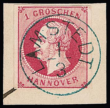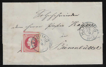 1 Gr. rosa, weit überrandig, links und oben Nebenmarke, auf Kabinettbrief von Harburg (K2) nach Bienenbüttel