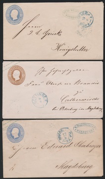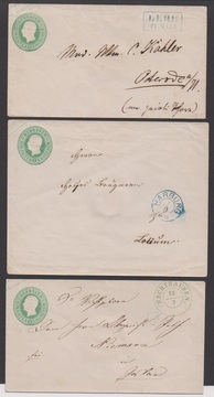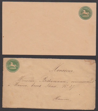 Ganzsache 1 Ggr. grün, ungefaltetes Prachtcouvert im seltenen Großformat (K2 "Harburg"), sowie zwei gebrauchte Couverts im normalen Format (u.a. K2 "Hechthausen"), Mi. 320,-