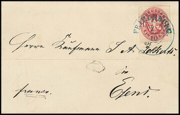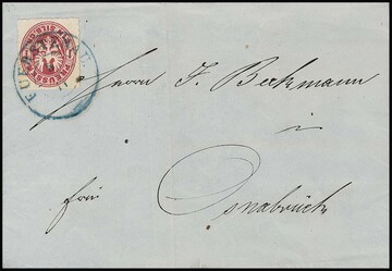 "Hannover", (1866), blauer K2 auf portofreiem Vordruckbrief der "Milit.-Wittwen- u. Waisen-Unterst.-Gesellschaft", hs. "0 fr.", nach Hagen