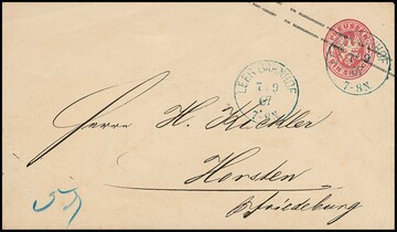 "Leer Bahnhof", seltener neuer preuß. K1 in blau auf Preußen-Ganzsachen-Couvert 1 Sgr. rosa vom 7.9.1867