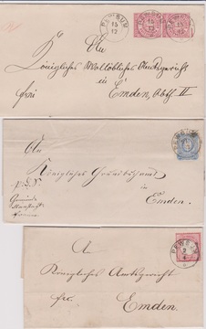 "Pewsum", nachverw. schwarzer K2 auf drei Briefen, Paar NDP 1 Gr., 1 Gr. Brustschild sowie 20 Pfge.