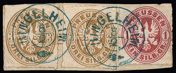 "Ringelheim", nachverw. blauer Zier-K2 klar auf dekorativem Briefstück mit Preußen 1 Sgr. (diese etwas Schere) und zweimal 3 Sgr.