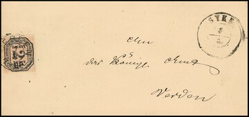 "Syke", blauer K2 auf zwei Kabinettbriefen mit Randstücken 1 Ggr. schw./graugrün und 1 Gr. lilarot, auf Briefvs. 1 Ggr., sowie nachverw. auf Kabinettbrief Preußen 1 Sgr.