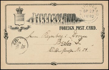 Ganzsache 10 Pfg. rot, Kabinettcouvert mit Helgoländer Rundstempel 1878, adressiert an die Frau des Postmeisters Pilger in Berlin mit Ankunftsstempel. Mi. 300,-