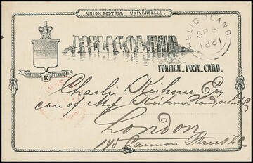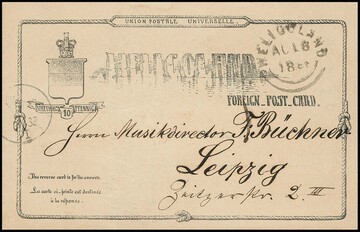 Ganzsachenkarte 10 Pfg. 1881 von Helgoland (Rundstempel) nach London gelaufen