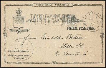 Ganzsachenkarte 10 Pfg. mit Rundstempel "Helgoland" nach Böhmen, sowie mit L1 (selten, für Post in den Schiffspostkasten) nach Heidelberg, kl. Eckbug. Dazu drei ungebrauchte Karten