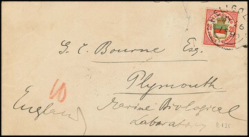 20 Pfg., 6. Auflage, spät verwendet einzeln auf Auslandscouvert (kl. Mgl., u.a. Öffnungsriß, Marke kurze Z.) 1890 von Helgoland nach Plymouth/England