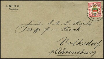 Ganzsache 10 Pfg. rot (seitlich gering verkürzt) am letzten Tag, 10.8.1890, aufgeliefert mit neuem K1 "Helgoland", jedoch nicht mehr akzeptiert und mit "20" Pfg. Nachtaxe versehen, nach Cuxhaven